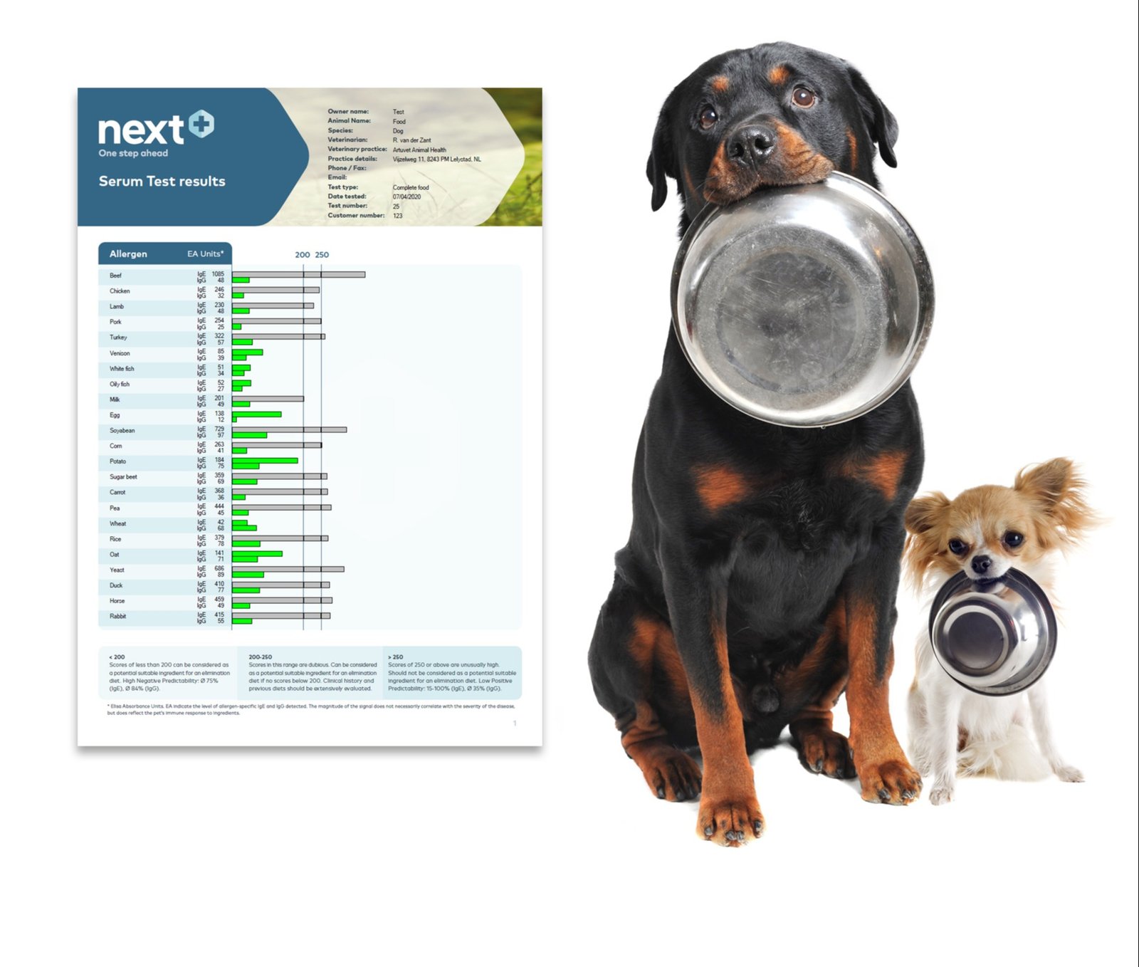 The Next+ Food Test is a serum test that examines food-specific IgE and IgG levels for 23 different allergens. It comes with clear advice on potential suitable ingredients and commercial diets for a food elimination trial.
